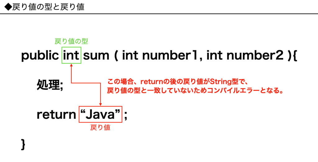 つまり、returnの後の値、もしくは変数の型は戻り値の型で指定した型と一致していないとコンパイルエラーとなります。