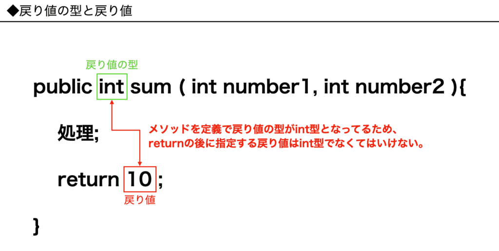 この時、戻り値の型をvoid以外で定義した場合、そのメソッドは戻り値の型と一致する値を返す必要があります。